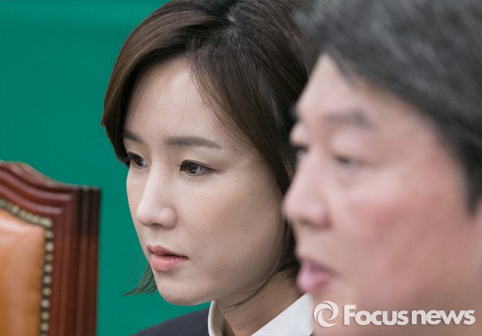(서울=포커스뉴스) 2일 오전 서울 여의도 국회에서 열린 국민의당 최고위원회의에 국민대표 직함으로 참석한 故 가수 신해철의 아내 윤원희(왼쪽) 씨가 안철수 상임공동대표의 발언을 듣고 있다.