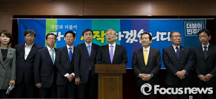(광주=포커스뉴스) 김종인 더불어민주당 비대위 대표가 25일 오후 광주광역시의회 브리핑룸에서 광주 및 전남 언론사 기자간담회를 하고 있다. 왼쪽부터 전현희 당선인, 이춘석, 정성호, 양승조 비대위원, 이종걸 원내대표, 김 대표, 정세균 의원, 이개호, 진영 비대위원.