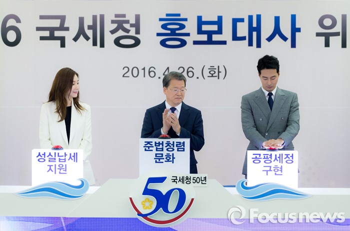(서울=포커스뉴스) 26일 오후 서울 종로구 서울지방국세청에서 임환수(가운데) 국세청장이 홍보대사로 위촉된 배우 조인성(오른쪽), 최지우와 홍보대사 위촉 퍼포먼스를 하고 있다.