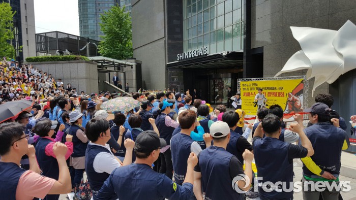 노동절인 1일 민주노총 서비스연맹은 서울 중구 신세계백화점 본점에서 '민주노조 탄압, 반노동 갑질 기업 신세계이마트, 롯데마트 규탄 서비스노동자 결의대회'를 열고 이마트의 노조탄압 중단과 정부의 노동법 개정을 규탄했다.