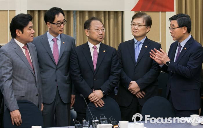(서울=포커스뉴스) 27일 오전 서울 여의도 국회 귀빈식당에서 열린 청년 · 여성 일자리대책 당정협의 참석자들이 대화하고 있다. 왼쪽부터 원유철 새누리당 대표최고위원 권한대행, 이준식 사회부총리, 유일호 경제부총리, 최양희 미래창조과학부 장관, 이기권 고용노동부 장관.