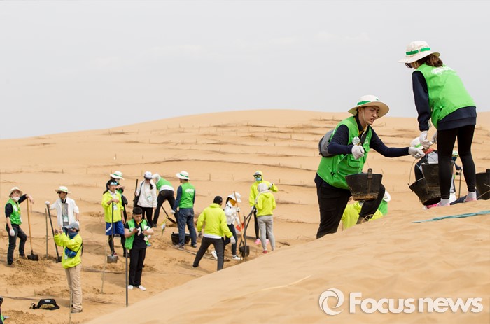 (다라더치/중국=포커스뉴스) 25일 오후 중국 내몽고 다라더치 쿠부치사막에서 2016 미래숲 15기 녹색봉사단원들이 나무 심기 작업을 하고 있다. 미래숲 녹색봉사단은 이번 봉사활동을 통해 황폐화된 사막에 나무 심기 및 각국 청년들과 우호를 증진을 위한 교류 활동을 전개했다.