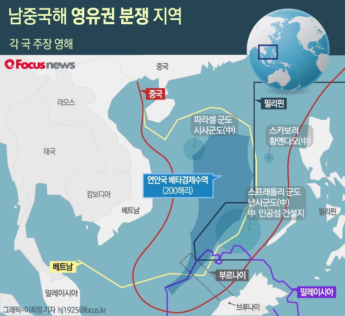 대만, 베트남, 말레이시아, 브루나이 역시 남중국해에서 영유권을 주장한다.