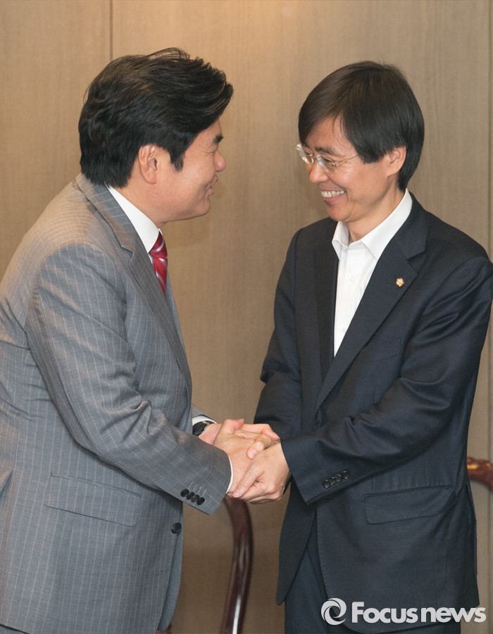 (서울=포커스뉴스) 원유철(왼쪽) 새누리당 원내대표와 조경태 의원이 25일 오후 서울 여의도의 한 중식당에서 열린 중진의원 오찬 간담회에 참석해 악수하고 있다.
