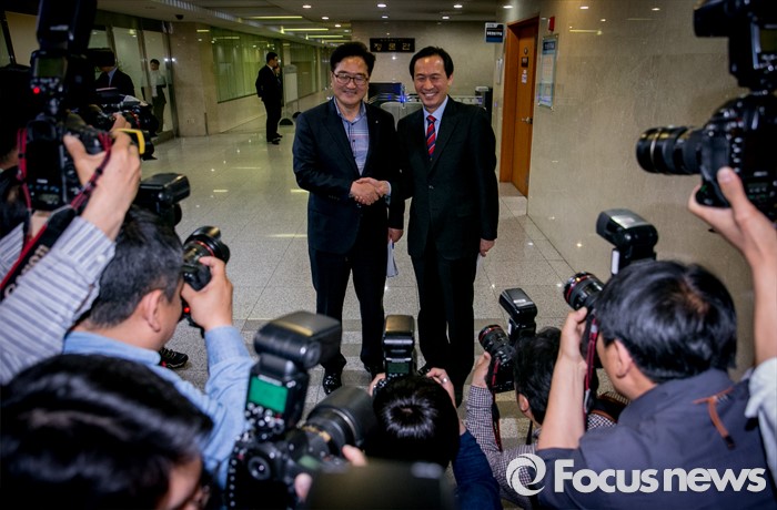 (서울=포커스뉴스) 원내대표 경선에 출마하는 우상호(오른쪽), 우원식 더불어민주당 의원이 29일 오후 서울 여의도 국회 정론관 앞에서 만나 취재진을 향해 포즈를 취하고 있다.