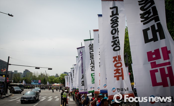 (서울=포커스뉴스) 근로자의날을 맞은 1일 오후 서울광장에서 열린 한국노총 5.1 전국노동자대회를 마친 참가자들이 종로로 행진을 이어가고 있다.