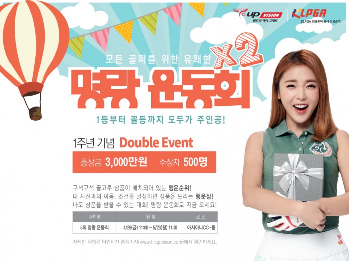 한편, 티업비전은 지난해말 기준 스크린골프 센서 시장점유율과 골프 코스 보유 수 2위를 기록하며 골프존에 이어 2위 업체로 부상했다. 스크린골프에 IT 기술을 접목해 업계 최초로 네트워크 대전과 캐디 시스템을 도입했으며, 게임적 요소를 결합한 아이템전을 선보이기도 했다.'명랑운동회' 개최를 알리는 포스터.<사진제공=마음골프>