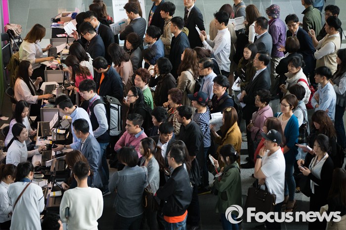 (서울=포커스뉴스) 28일 오전 서울 삼성동 코엑스에서 열린 2016 국제건강산업박람회에 참가하기 위해 시민들이 길게 줄을 서있다.