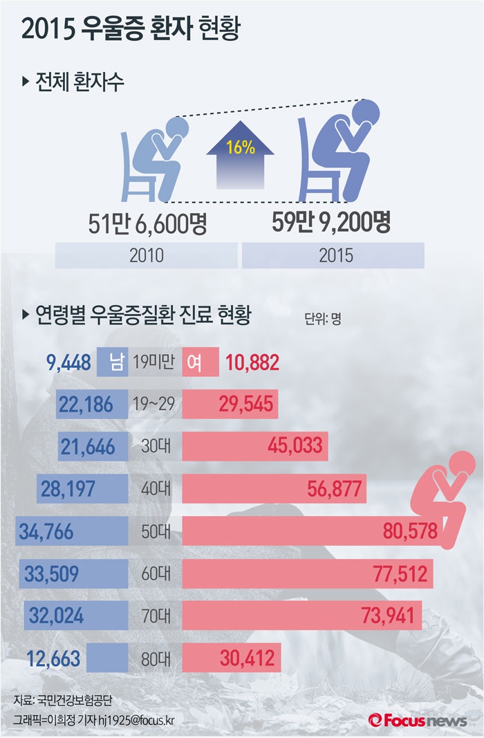(서울=포커스뉴스) 26일 국민건강보험공단에 따르면 우울증 증상으로 병원을 찾은 환자는 2010년 51만6,600명에서 16% 증가한 59만9,200명인 것으로 나타났다.