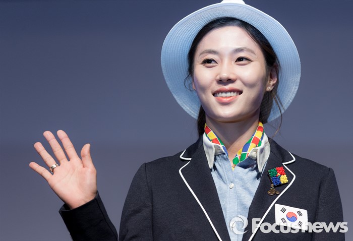 (서울=포커스뉴스) 27일 오후 서울 노원구 태릉선수촌에서 열린 제31회 리우하계올림픽대회 D-100일 미디어데이에서 펜싱 국가대표 김지연이 리우올림픽 선수단 단복을 선보이고 있다.