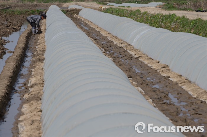 (파주=포커스뉴스) 25일 오전 경기도 파주시 오두산 인근 논밭에서 한 농부가 비닐하우스에 있는 벼들을 위해 공기를 환기시키고 있다.