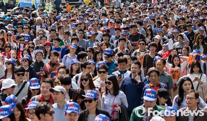 (서울=포커스뉴스) 근로자의날을 맞은 1일 오후 서울광장에서 열린 한국노총 5.1 전국노동자대회를 마친 참가자들이 종로로 행진을 이어가고 있다.