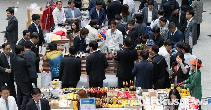 (대전=포커스뉴스) 28일 오전 정부대전청사 중앙홀에 마련된 개성공단 우수상품 특별판매전에서 공무원들이 제품을 살피고 있다. 개성공단 우수상품 특별판매전은 개성공단 입주기업 피해를 최소화 하기 위해 중소기업청이 주최했다.