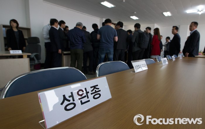 (부여=포커스뉴스) 29일 오후 이완구 전 국무총리가 2013년 재보궐 선거 때 사용한 충남 부여 선거사무소에서 서울고법 형사2부 관계자들이 현장검증을 실시한 가운데 선거사무소 책상에 성완종 전 회장의 명패가 올려져 있다.