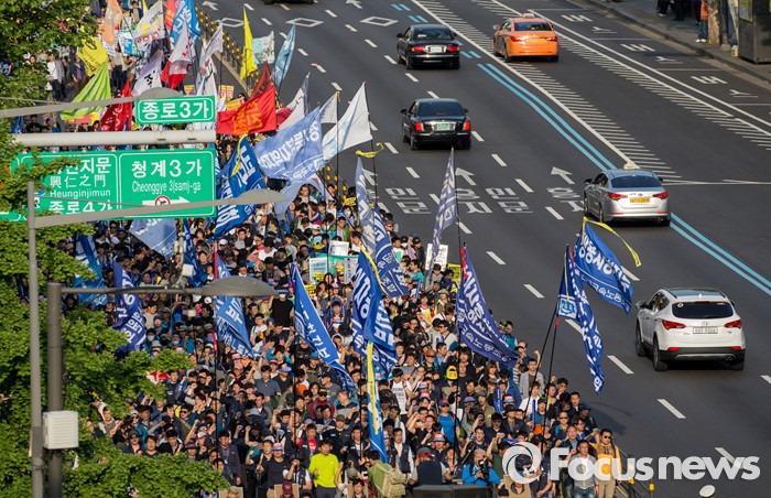 (서울=포커스뉴스) 근로자의날을 맞은 1일 오후 서울 종로구 대학로에서 민주노총 주최로 열린 '2016 세계노동절대회'를 마친 참가자들이 종로로 행진을 이어가고 있다.
