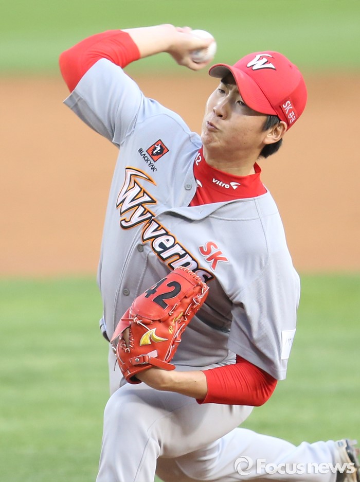 (서울=포커스뉴스) 28일 서울 잠실구장에서 열린 2016 프로야구 SK-두산 경기에서 1회말 SK 선발투수 문승원이 투구하고 있다.