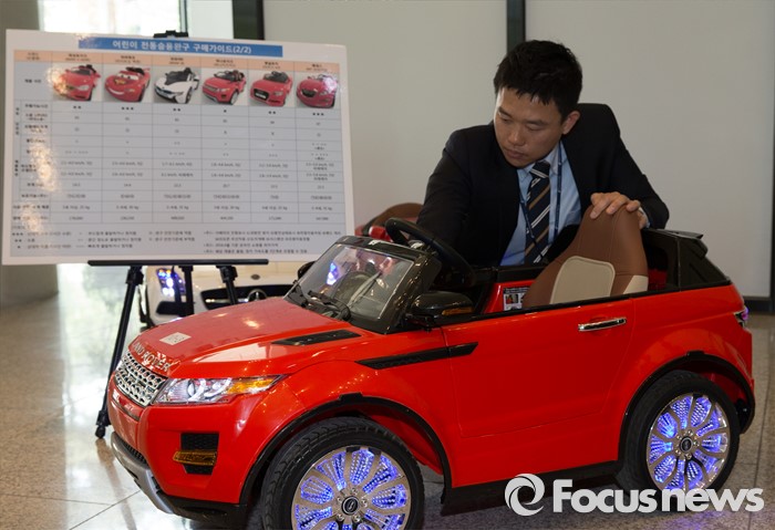 (세종=포커스뉴스) 2일 오전 세종시 정부세종청사 공정거래위원회에서 한국소비자원 관계자가 어린이 전동 승용완구 성능 및 안전성 등 제품별 차이를 설명하고 있다.