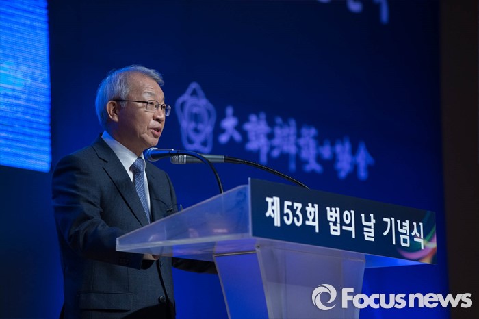 (서울=포커스뉴스) 양승태 대법원장이 25일 오전 서울 서초구 대검찰청에서 열린 제53회 법의날 기념식에서 기념사를 하고 있다.