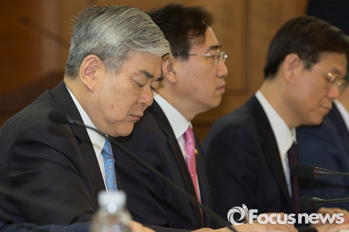 (서울=포커스뉴스) 29일 오전 서울 종로구 정부서울청사에서 열린 평창동계올림픽지원위원회에서 조양호(왼쪽) 평창동계올림픽 조직위원장이 황교안 국무총리의 모두발언을 듣고 있다.