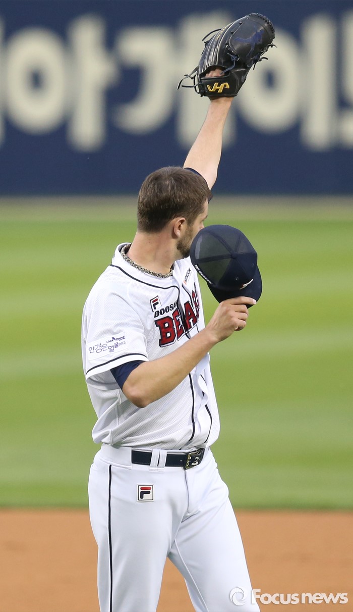 (서울=포커스뉴스) 26일 서울 잠실구장에서 열린 2016 프로야구 SK-두산 경기에서 1회초 두산 선발투수 니퍼트가 SK 최정의 타구를 펜스에 부딪치며 잡은 중견수 정수빈을 향해 글로브를 흔들며 격려의 사인을 보내고 있다.