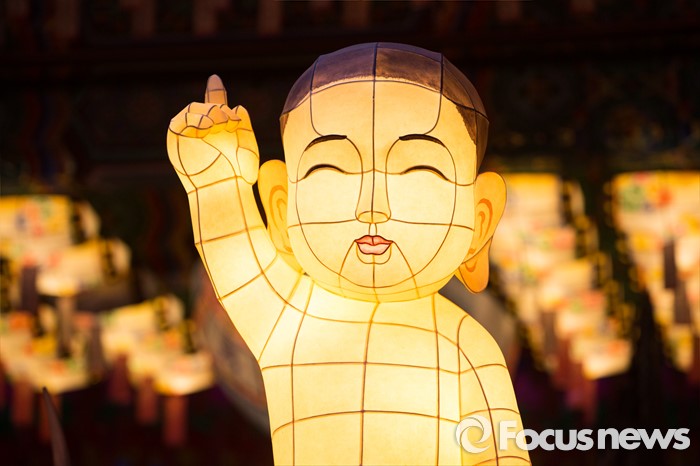 (서울=포커스뉴스) 부처님오신날을 앞두고 26일 밤 서울 종로구 견지동 조계사 정문 앞에아기 부처님 형태의 연등이 불을 밝히고 있다.