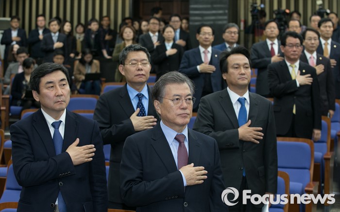 선관위는 또 오는 29일부터 30일까지 후보자 등록을 받은 후 기호추첨을 하기로 결정했다. 또 원내대표 경선 당일인 4일 오전 10시 토론회를 진행하고 오후 2시에 정견발표 및 원내대표 선출을 하기로 일정을 확정했다.문재인(오른쪽) 새정치민주연합 대표와 이종걸 원내대표 등 의원들이 12일 오전 서울 여의도 국회에서 열린 정책 의원총회에 참석해 국기에 대한 경례를 하고 있다. 2015.11.12 박동욱 기자