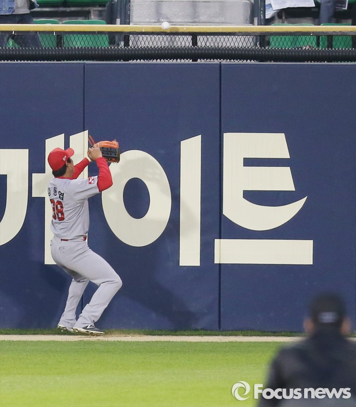 (서울=포커스뉴스) 28일 서울 잠실구장에서 열린 2016 프로야구 SK-두산 경기 3회말 2사후 두산 김재호가 때린 타구가 좌중간 펜스 상단에 맞고 있다.
