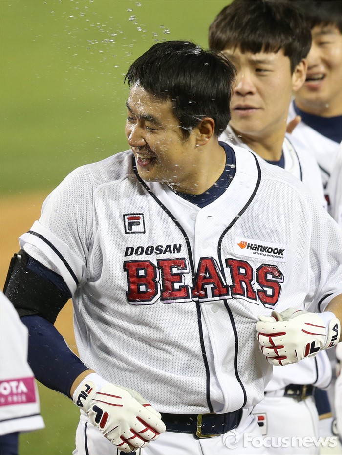 (서울=포커스뉴스) 28일 서울 잠실구장에서 열린 2016 프로야구 SK-두산 경기 9회말 1사 1,2루에서 끝내기 우월 3점홈런을 날린 두산 김재환이 축하의 물세례를 받고 있다.