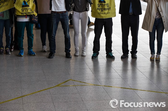 (서울=포커스뉴스) 가습기 살균제 과실 책임을 받고 있는 신현우 전 옥시 대표가 피의자 신분으로 검찰로 출두한 26일 오전 서울 서초구 서울중앙지방검찰청에 가습기 살균제 피해자들이 사과를 촉구하는 손펫말을 들고 있다.