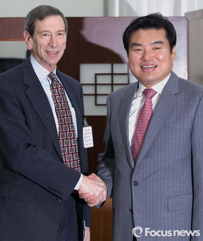 (서울=포커스뉴스) 원유철(오른쪽) 새누리당 원내대표가 27일 오후 서울 여의도 국회를 방문한 로버트 아인혼 전 미국 국무부 차관보와 면담에 앞서 악수하고 있다.