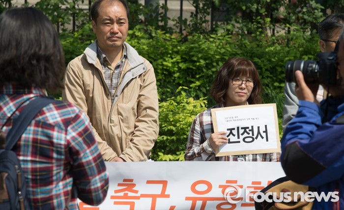 (서울=포커스뉴스) 29일 오전 서울 서초구 서울중앙지검 앞에서 열린 '불법 기업주 강력 처벌 촉구, 유흥희 분회장 항의 노역' 기자회견에 참석한 유흥희 기륭전자 노조분회장이 진정서를 들고 있다.