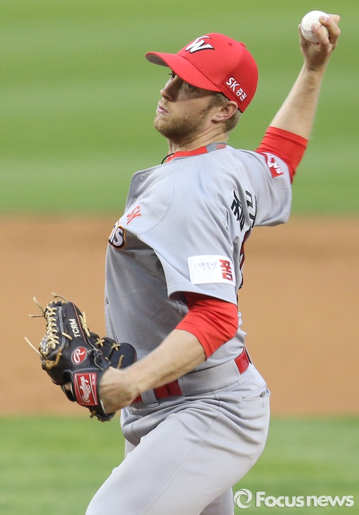 (서울=포커스뉴스) 26일 서울 잠실구장에서 열린 2016 프로야구 SK-두산 경기에서 1회말 SK 선발투수 켈리가 투구하고 있다.
