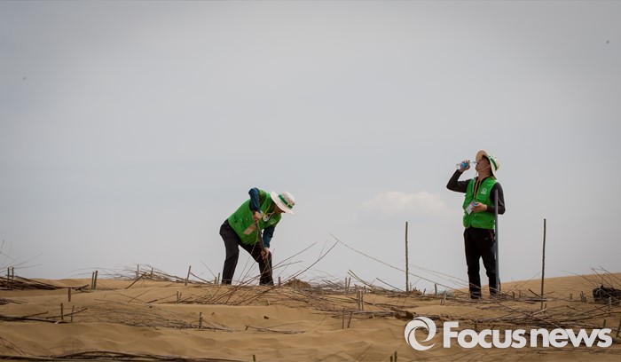 (다라더치/중국=포커스뉴스) 25일 오후 중국 내몽고 다라더치 쿠부치사막에서 2016 미래숲 15기 녹색봉사단원들이 나무 심기 작업을 하고 있다. 미래숲 녹색봉사단은 이번 봉사활동을 통해 황폐화된 사막에 나무 심기 및 각국 청년들과 우호를 증진을 위한 교류 활동을 전개했다.