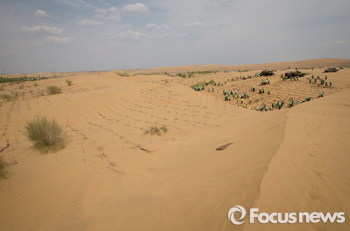 (다라더치/중국=포커스뉴스) 25일 오후 중국 내몽고 다라더치 쿠부치사막에서 2016 미래숲 15기 녹색봉사단원들이 나무 심기 작업을 하고 있다. 미래숲 녹색봉사단은 이번 봉사활동을 통해 황폐화된 사막에 나무 심기 및 각국 청년들과 우호를 증진을 위한 교류 활동을 전개했다.