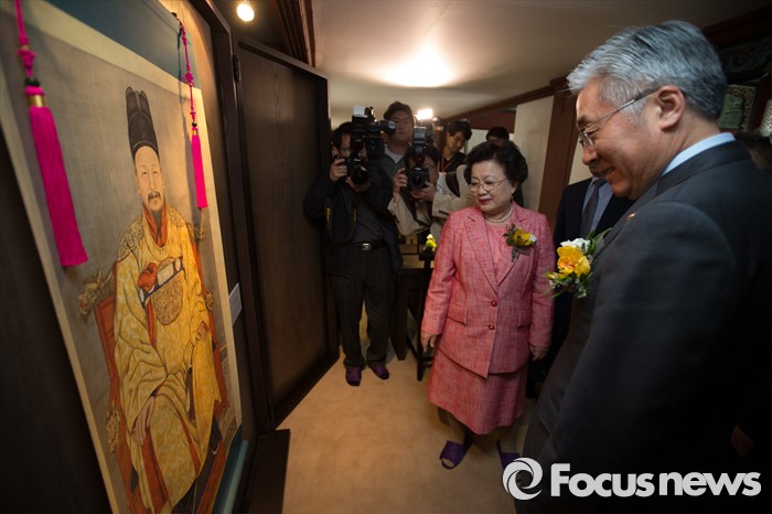 (서울=포커스뉴스) 27일 오후 서울 종로구 경복궁 집옥재에서 열린 궁궐 속 작은도서관 집옥재 개관행사를 마친 뒤 김종덕(오른쪽) 문화체육관광부 장관과 이배용 한국학중앙연구원 원장이 내부에 있는 고종의 어진을 보고 있다.