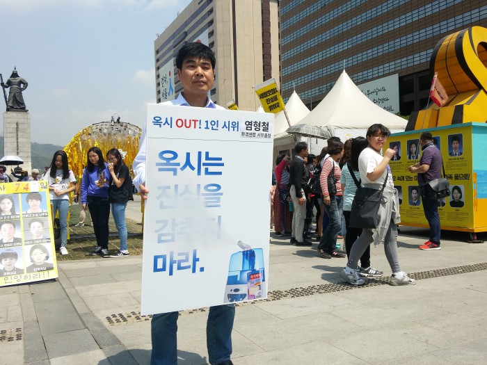 강찬호 가습기살균제피해자와가족모임(이하 가피모) 대표와 염형철 환경운동연합 사무총장은 2일 오전 서울 광화문 광장에서 1인 시위를 시작하며 "지난 15년간 침묵했던 옥시가 처벌이 다가오니 인제야 사과하겠다고 나섰다"며 "파렴치한 살인기업 옥시의 가식적인 사과는 받지 않겠다"고 옥시 측을 규탄했다.