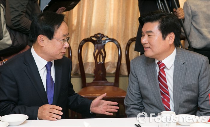 (서울=포커스뉴스) 원유철(왼쪽) 새누리당 원내대표와 이주영 의원이 25일 오후 서울 여의도의 한 중식당에서 열린 중진의원 오찬 간담회에 참석해 대화하고 있다.