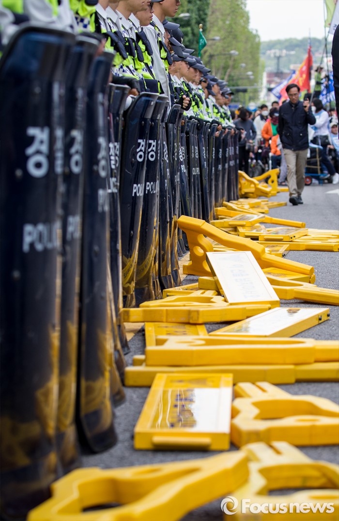 (서울=포커스뉴스) 근로자의날을 맞은 1일 오후 서울 종로구 대학로에서 민주노총 주최로 열린 '2016 세계노동절대회'에서 경찰과 420장애인차별철폐공동투쟁단원들이 충돌하고 있다.