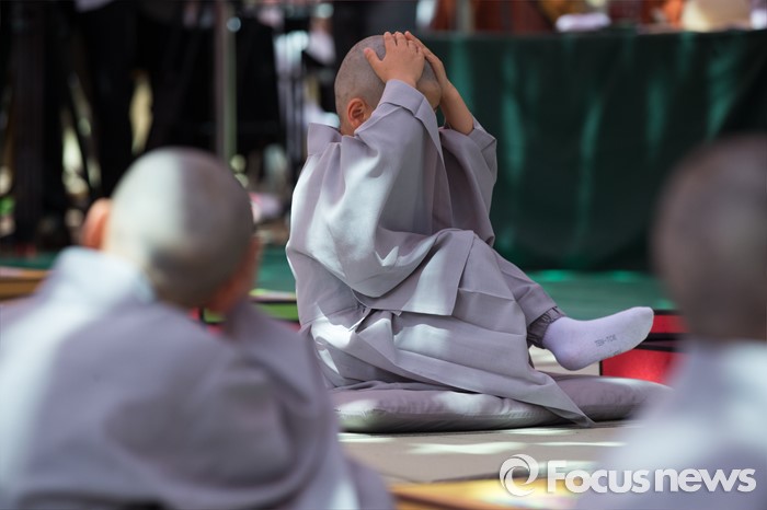 (서울=포커스뉴스) 2일 오전 서울 종로구 조계사 대웅전 앞마당에서 열린 동자승 단기출가 보리수 새싹학교 삭발, 수계식에서 동자승들이 삭발을 마친 뒤 머리를 만져보고 있다.