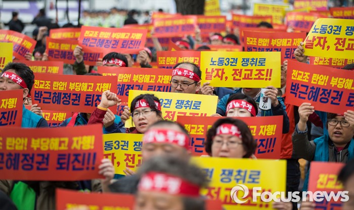 (서울=포커스뉴스) 27일 오후 서울 종로구 정부종합청사 앞에서 전교조(전국교직원노동조합)와 민주교육과 전교조 지키기 전국행동의 주최로 법외노조 후속조치 규탄 및 부당해고 저지, 노동기본권 쟁취를 위한 집회가 열리고 있다.