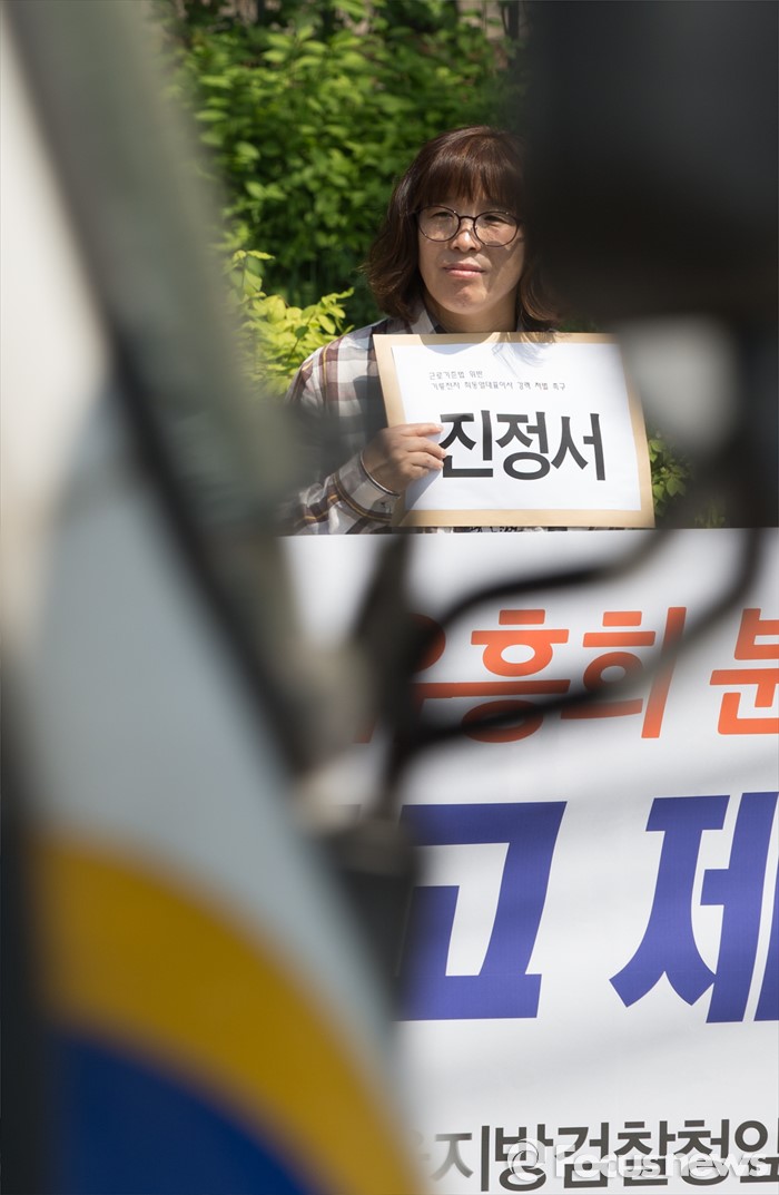 (서울=포커스뉴스) 29일 오전 서울 서초구 서울중앙지검 앞에서 열린 '불법 기업주 강력 처벌 촉구, 유흥희 분회장 항의 노역' 기자회견에 참석한 유흥희 기륭전자 노조분회장이 진정서를 들고 주변을 살펴보고 있다.