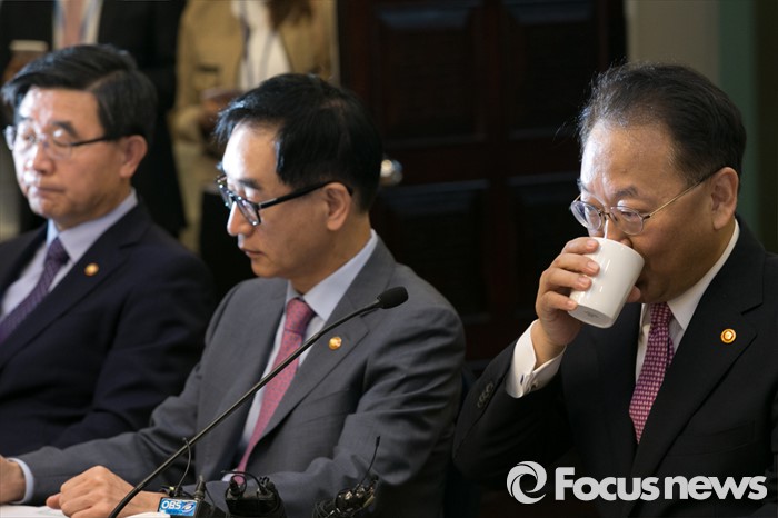 (서울=포커스뉴스) 유일호(오른쪽) 경제부총리가 27일 오전 서울 여의도 국회 귀빈식당에서 열린 청년 · 여성 일자리대책 당정협의에 참석해, 물을 마시고 있다. 오른쪽부터 유 부총리, 이준식 사회부총리, 이기권 고용노동부 장관.