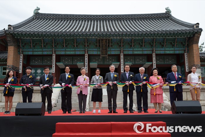(서울=포커스뉴스) 27일 오후 서울 종로구 경복궁 집옥재에서 열린 궁궐 속 작은도서관 집옥재 개관행사에 김종덕(오른쪽 여섯번째) 문화체육관광부 장관과 주요인사들이 테이프커팅을 하고 있다.