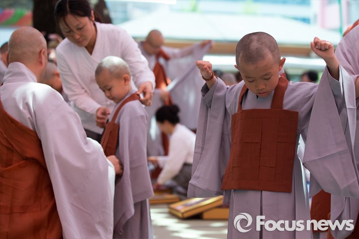 (서울=포커스뉴스) 2일 오전 서울 종로구 조계사 대웅전 앞마당에서 열린 동자승 단기출가 보리수 새싹학교 삭발, 수계식에서 동자승들이 삭발을 마친 후 스님의 도움을 받고 있다.