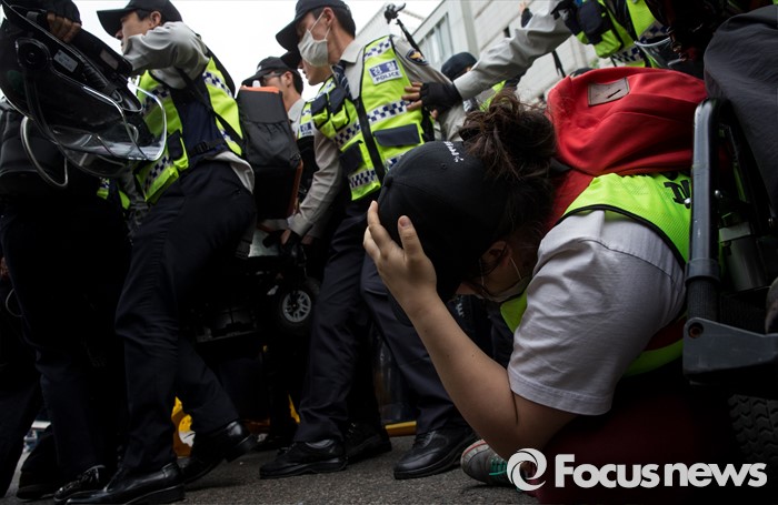 (서울=포커스뉴스) 근로자의날을 맞은 1일 오후 서울 종로구 대학로에서 민주노총 주최로 열린 '2016 세계노동절대회'에서 경찰과 420장애인차별철폐공동투쟁단원들이 충돌하고 있다.