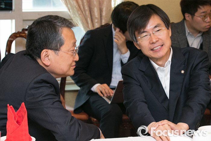 (서울=포커스뉴스) 새누리당 정희수(왼쪽), 조경태 의원이 25일 오후 서울 여의도의 한 중식당에서 열린 중진의원 오찬 간담회에 참석해, 대화하고 있다.