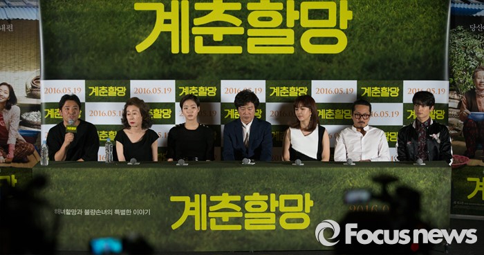 (서울=포커스뉴스) 2일 오후 서울 성동구 왕십리 CGV에서 열린 영화 '계춘할망' 언론시사회에 참석한 창감독이 인사말을 하고 있다. 왼쪽부터 창감독, 배우 윤여정, 김고은, 김희워느 신은정, 양익준, 최민호.
