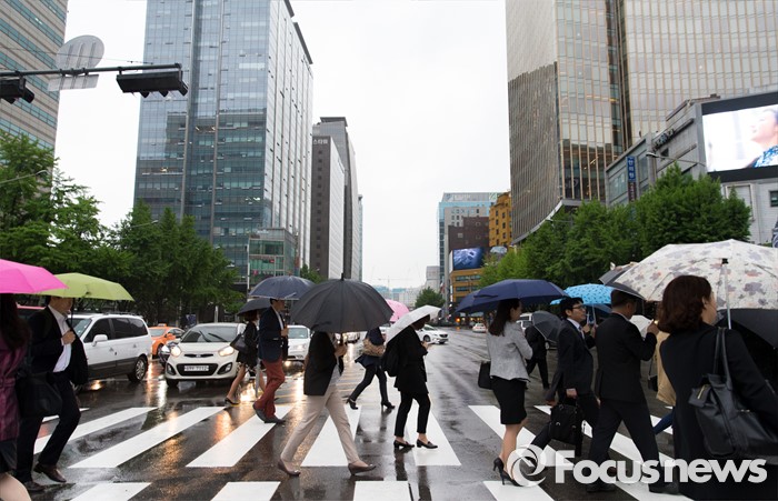 (서울=포커스뉴스) 전국이 흐리고 비가 내리는 3일 오전 서울 광화문네거리에서 시민들이 발걸음을 재촉하고 있다.