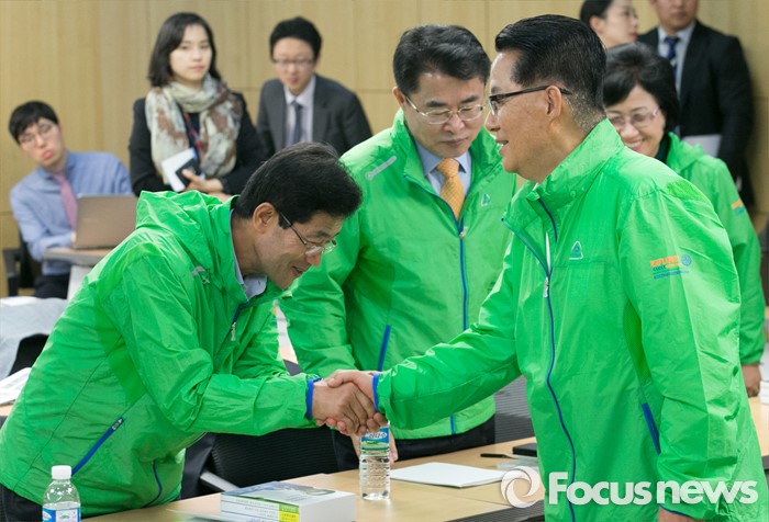 (서울=포커스뉴스) 박지원(오른쪽) 국민의당 원내대표가 3일 오전 서울 여의도 국회 의원회관에서 열린 정책역량 강화 집중워크샵에 참석해 20대 국회 초선 당선인들과 인사하고 있다.