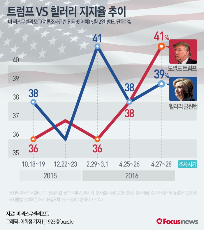 (서울=포커스뉴스) 2일(현지시간) 미 여론조사기관 라스무센리포트가 공개한 여론조사결과에 따르면도널드 트럼프가41%의 지지율로 39%를 기록한 힐러리 클린턴을 앞섰다. 직전의 여론조사에서는 두 사람 모두 38%로 지지율이 같았다.